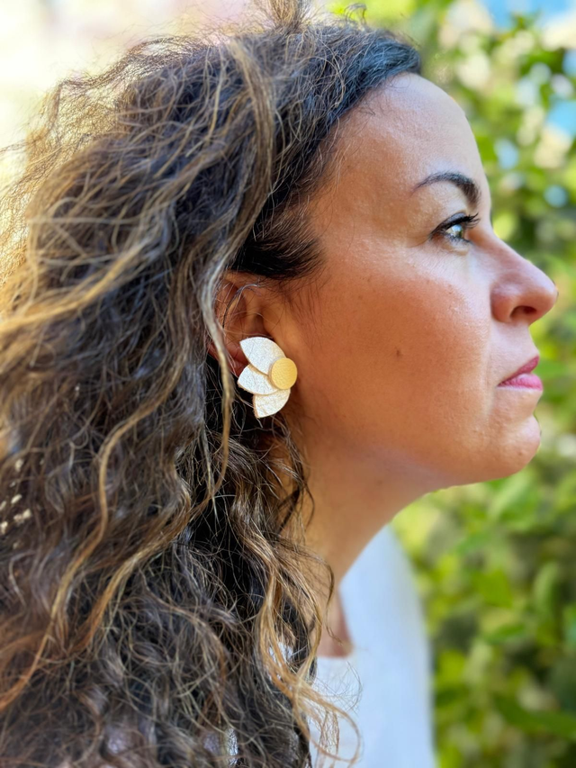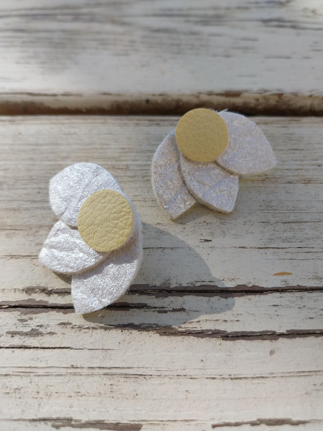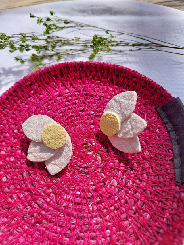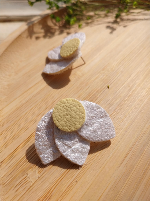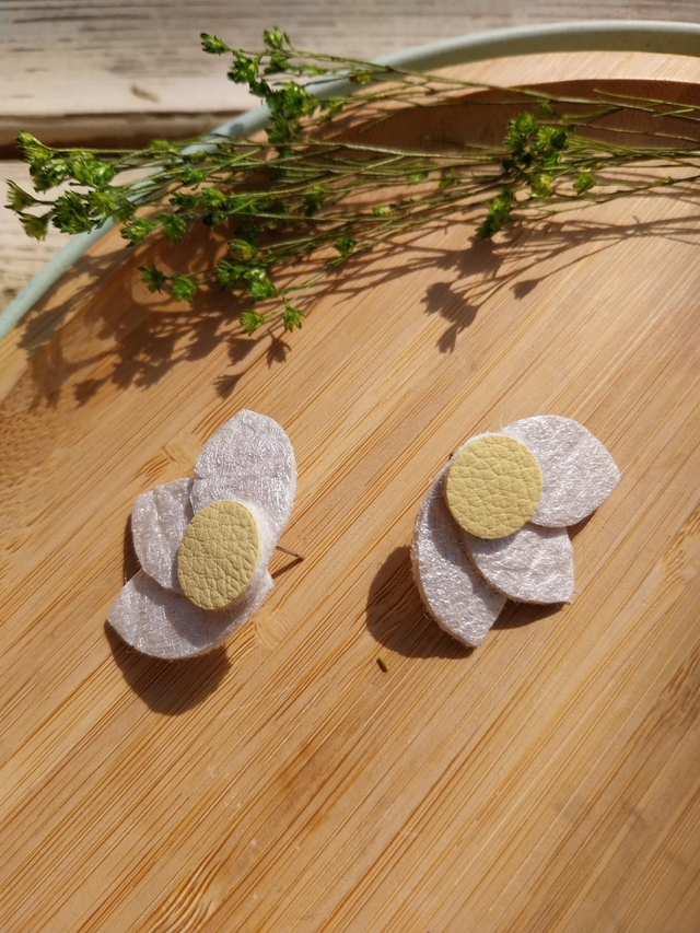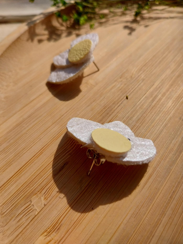 ✨️ Boucles d'oreilles marguerite en matière végétale d'ananas. Couleurs blanc irisé et jaune poussin.